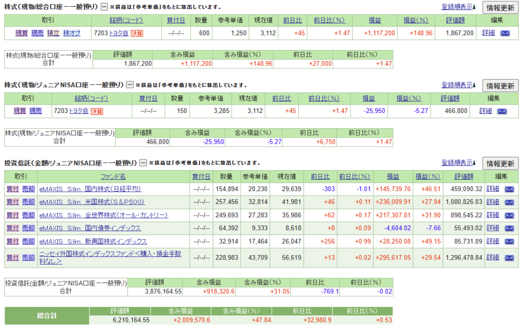 約3年前に積立を終了して放置しているが、2026/04/28現在、上の子の教育資金として見ている資産(現金除く)は約621万円になった。